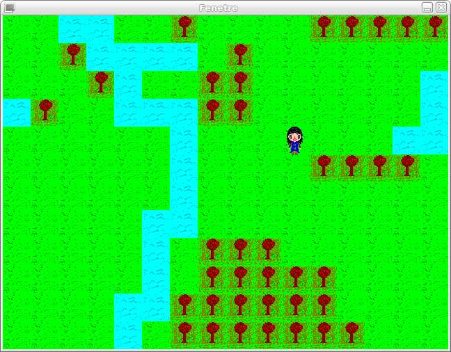 Nous avons implémenté le déplacement du personnage dans la map, en utilisant le curseur du clavier. L'image du personnage change en fonction de sa direction. Les collisions ne sont pas encore pris en charge.